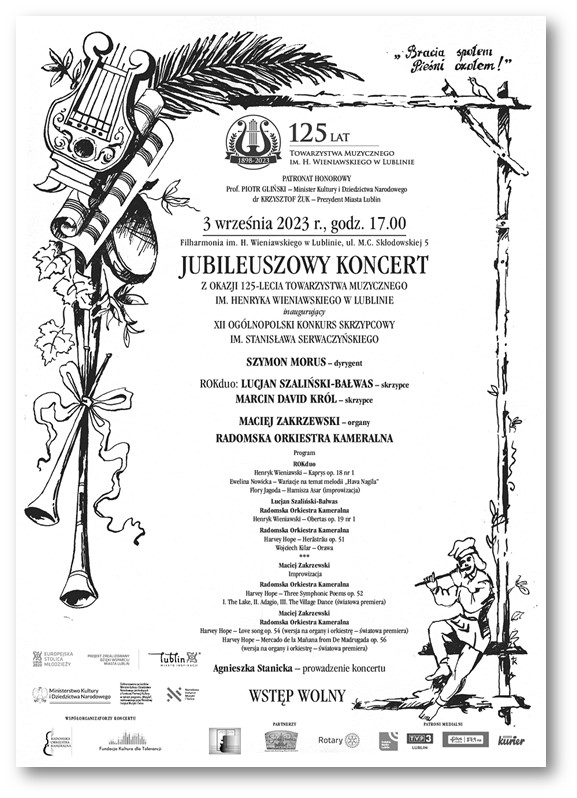 Koncert był jednocześnie inauguracją XII Ogólnopolskiego Konkursu Skrzypcowego im. Stanisława Serwaczyńskiego (pierwszego nauczyciela H. Wieniawskiego), w którym to konkursie Rotarianie lubelscy fundują nagrodę im. Jacka Osowskiego (nieżyjącego już członka naszego Rotary Club i legendarnego dyrektora LTM) dla laureatów w grupie starszej i grupie młodszej. Finał i koncert laureatów – 07.09.2023 w sali koncertowej Szkoły Muzycznej, ul. Narutowicza 32a.