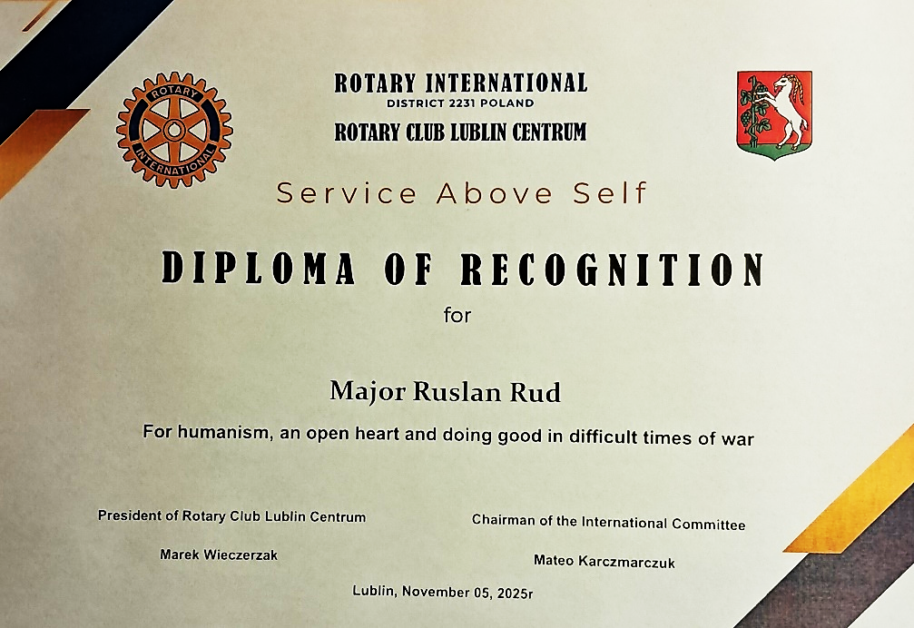 My jako Rotary Club Lublin Centrum uhonorowaliśmy człowieka niezwykłego – majora Rusłana Ruda ze Lwowa. Rusłan opiekuje się grupą stu kilkudziesięciu dzieci, którym wojna zabrała ojców, a czasem i matki.  On jako były czynny żołnierz miał i ma przykry obowiązek przekazywać  wiadomość o śmierci żołnierzy na froncie ich rodzinom („anioł śmierci”) i z powodów emocjonalnych nie zapomniał o dzieciach z tych rodzin, jest z nimi w kontakcie, a my (Rotary Club) razem z nim – jako „aniołem pokoju” tym razem i naszym partnerem w działalności humanitarnej – Centrum Wolontariatu –  już drugi rok realizujemy humanitarny projekt świąteczno-noworocznej pomocy dla tych dzieciaków o kryptonimie „125”. Rusłan został uhonorowany naszym Diploma of Recognition  „za humanizm, otwarte serce i czynienie dobra w trudnych czasach wojny” oraz nagrodą rzeczową w postaci nowoczesnego tabletu. Tablet został ufundowany przez naszego PP Sławka Krucikowskiego z jego własnych zasobów.