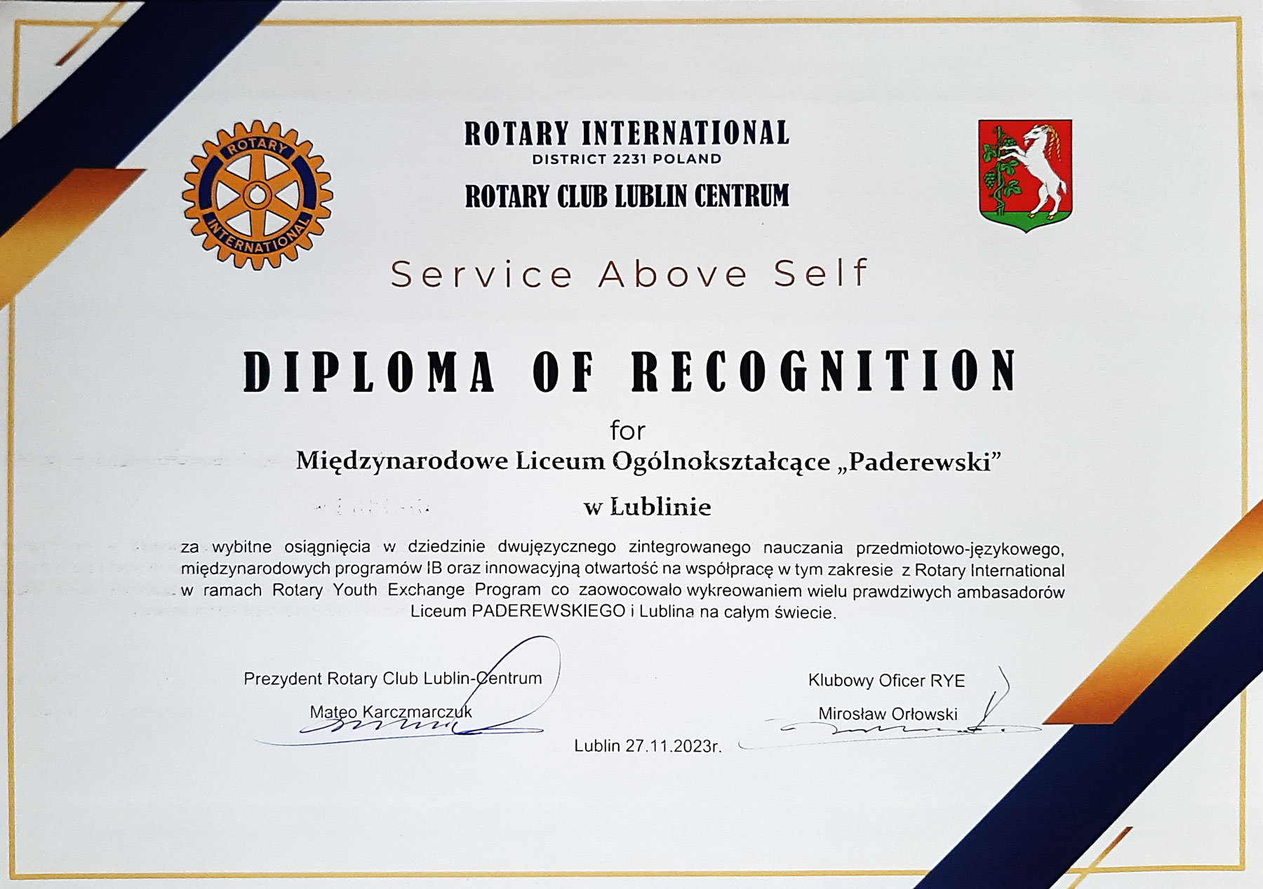 Międzynarodowe Liceum Ogólnokształcące PADEREWSKI w Lublinie jest od lat naszym partnerem w realizacji rotariańskiego programu wymiany młodzieży Rotary Youth Exchange Program (RYEP). Niemal wszyscy nasi przyjezdni uczestnicy tego programu uczyli się w tej szkole. Przyszedł więc czas, aby za tę dotychczasową wieloletnią współpracę podziękować.