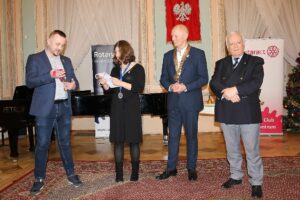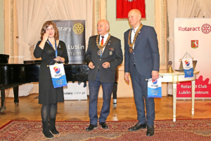 Mamy nowy młodzieżowy klub rotariański „Rotaract Club Lublin Centrum”! W dniu 22 stycznia 2024 odbyła się w zabytkowych wnętrzach Trybunału Koronnego na Starym Mieście w Lublinie uroczystość zagnieżdżenia tego Klubu (tradycyjna nomenklatura rotariańska); w międzynarodowych relacjach nazywana zwykle „Charter Day Ceremony”. Kartę czarterową (Charter Card) – oficjalny dokument potwierdzający rejestrację Klubu przez Rotary International w One Rotary Center w Evanston (USA) z podpisem Prezydenta Rotary International – Gordona R. McInally z kontrasygnatą Gubernatora Dystryktu 2232 Polska Marka Wcisło został wręczony pierwszej Prezydent Rotaract Club Lublin-Centrum – Hani Wieczorek- przez obecnych na uroczystości: Gubernatora Marka Wcisło i szefową struktur rotaractorskich w Dystrykcie 2231 – Jagodę Zmarz. Imponująca jest liczba członków założycieli (charter members) – bo 21. Wszyscy oni otrzymali specjalne „Diploma of Recognition” z poświadczeniem, że są członkami założycielami i z gratulacjami podpisane przez DG Marka Wcisło i Prezydenta klubu sponsorującego – RC Lublin Centrum – Mateo Karczmarczuka. Ponadto Mateo wręczył Prezydent Hani Wieczorek insygnia klubowe tj. dzwonek ceremonialny i takowąż „prezydencką” zawieszkę na szyję z logo RI i Rotaract. Po tym Hania rozpoczęła swoje pierwsze oficjalne zebranie używając tych insygniów i wygłosiła swój pierwszy speech.